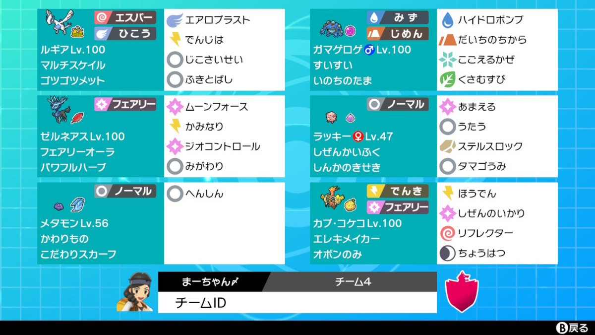 構築の始点、上手く起点を作ってジオコンを積めるとほとんど止まらない。技構成と努力値は【S31最終11位】ラキネクロトルネードF|ポケモンパーティ構築|ポケモン徹底攻略 (yakkun.com)を参考にしました。身代わりが本当に強く、電磁波で足を奪おうとしてくる相手にアドが取れ、また後述するルギアで撒いた電磁波バグを待つことができて使い勝手が良かったです。しかし、ドレインキッスを採用していないためHP管理がとても難しくサイクル加入させ辛かったです。個人的にゼルネアスは好きではなかったのですが、ルギアラッキーなどでサイクルを回して最後ゼルネアスで抜くといった動きがラグドラパに似ていてとても好きになりました。